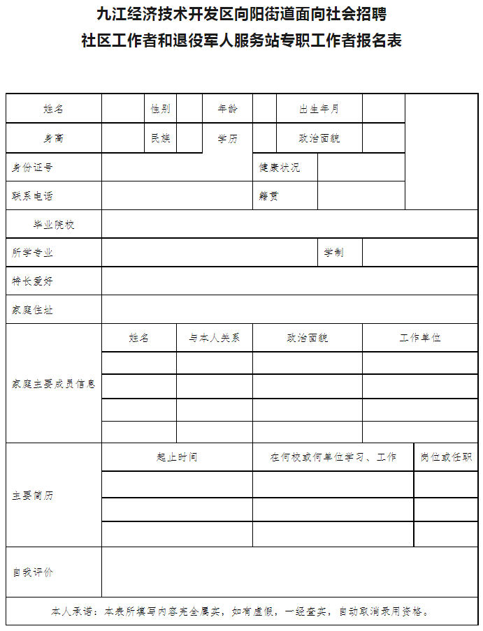 附件1:《九江经济技术开发区向阳街道面向社会招聘社区工作者和退役军人服务站专职工作者报名表》
