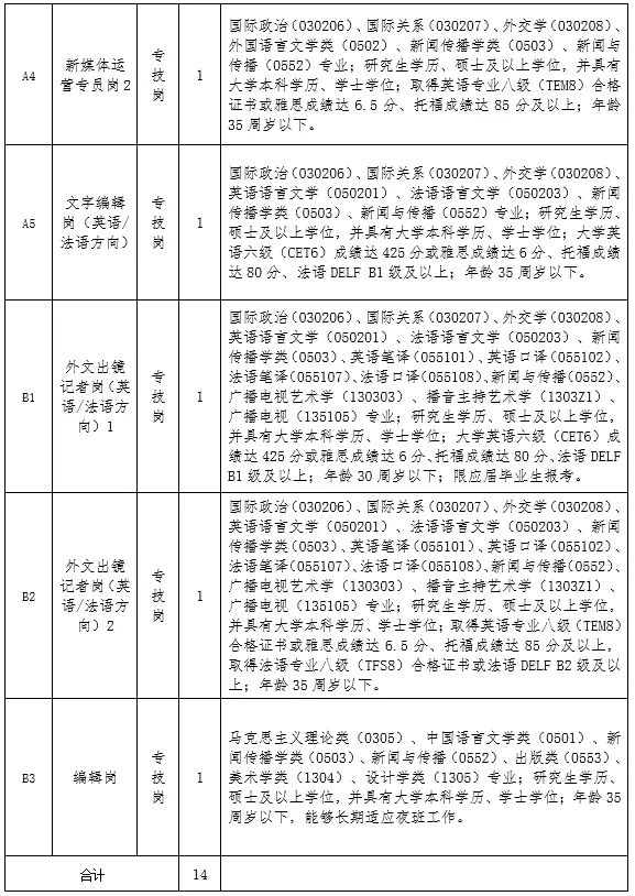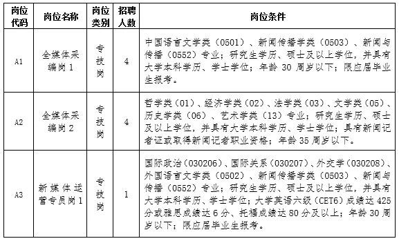 专业笔试主要考察应聘人员的相关专业知识。A1、A2、B3岗考察时事政治知识、新闻策划与采编能力、综合常识等。A3、A4、A5、B1、B2岗考察国际国内时事政治知识、新闻策划与采编能力、外语专业水平、综合常识等。