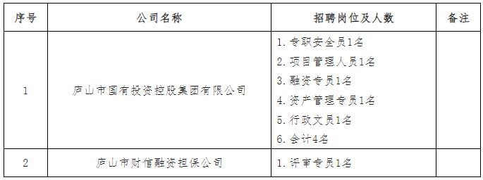 本次国控集团本部及下属融资担保公司面向社会招聘工作人员10名(国控集团本部9名、财信融资担保公司1名),招聘岗位及人数详见下表,具体岗位职责及任职要求详见(附件1)。