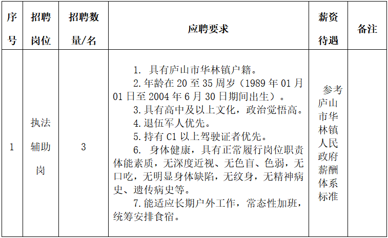 为提高基层服务能力,结合工作实际需要,经庐山市华林镇党委、政府研究,面向社会公开招聘综合行政辅助执法人员3名,现将公开招聘信息发布如下: