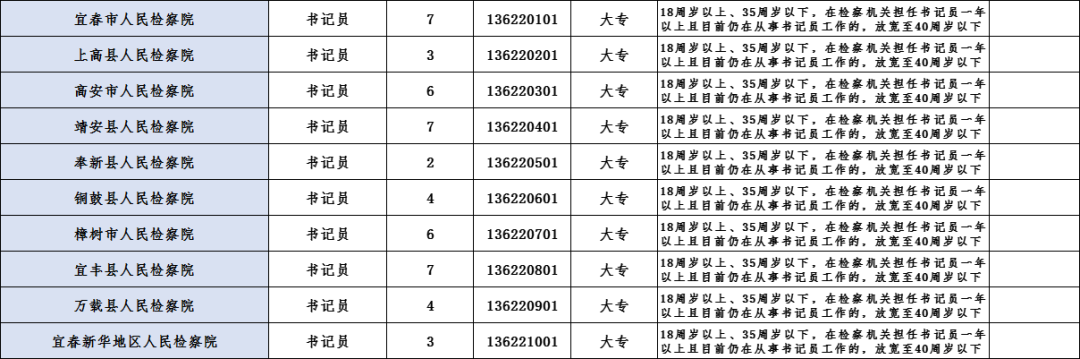 3.年龄在18周岁以上、35周岁以下(1986年11月1日至2004年10月31日期间出生),在检察机关担任书记员一年以上且目前仍在从事书记员工作的,年龄可放宽至40周岁(1981年11月1日以后出生);